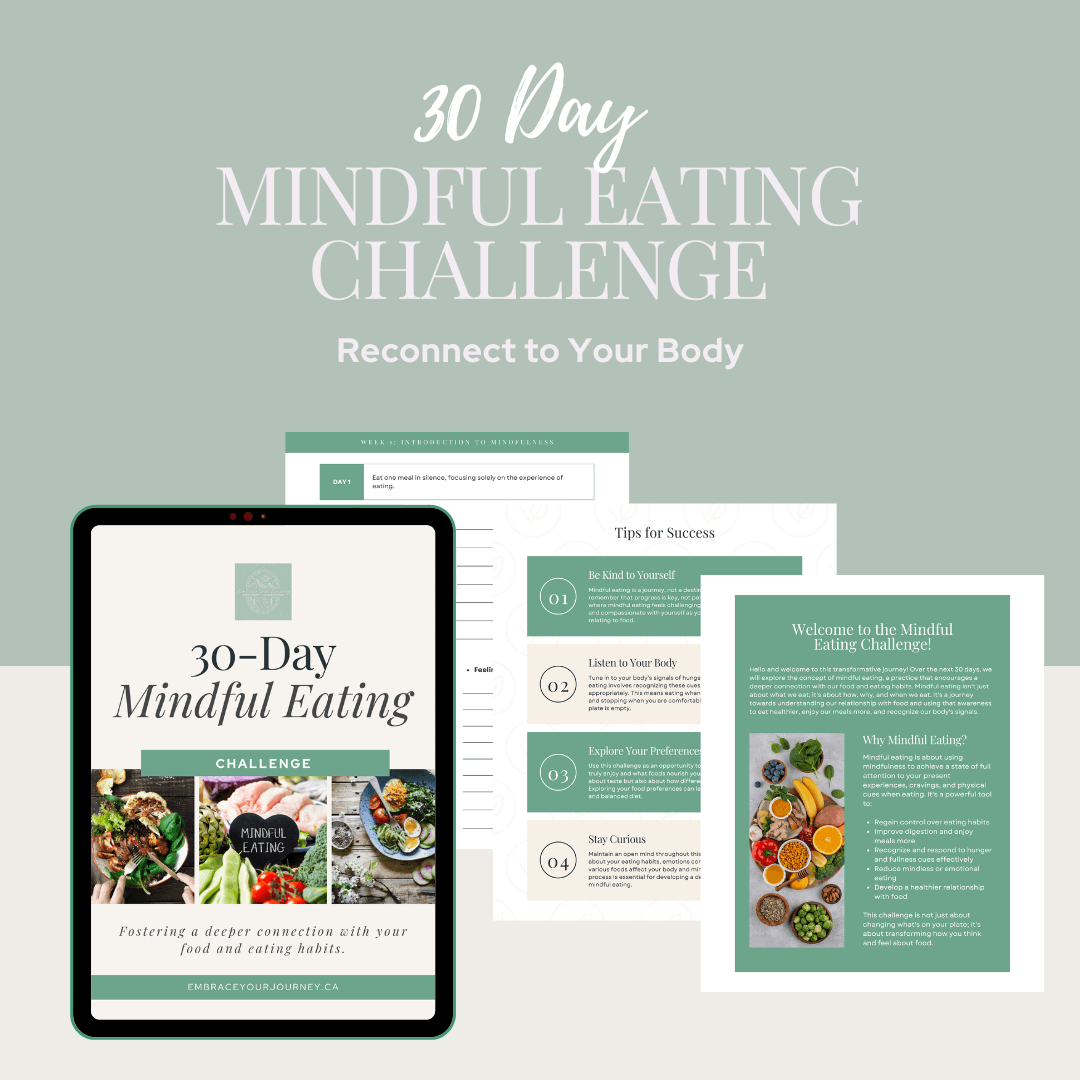 Inside this 40‑page printable PDF/e‑book, you’ll find daily prompts, practical exercises, and simple reflection pages that help you slow down, tune into your body, and build healthier eating habits with ease.